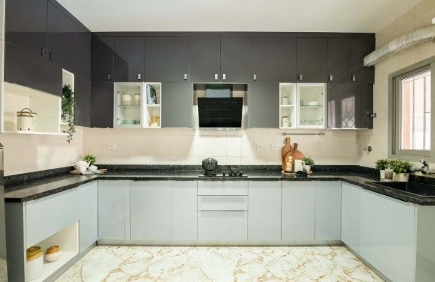 A modern kitchen that respects traditional Kerala cooking while incorporating contemporary conveniences. Custom cabinetry in warm wood tones complements granite countertops.