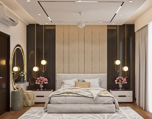 A peaceful retreat with soft, natural linens and a connection to the outdoors through floor-to-ceiling windows. The design prioritizes rest and relaxation.